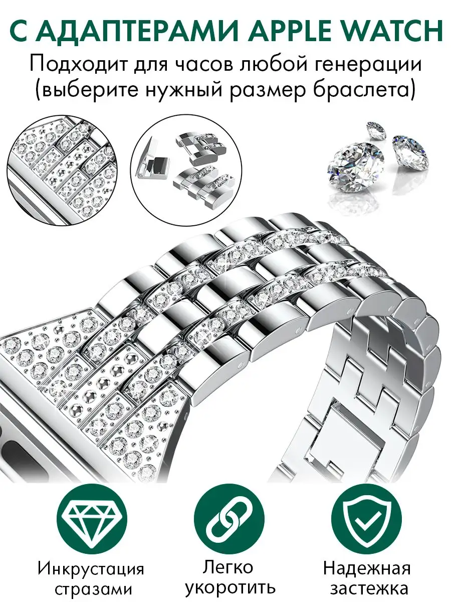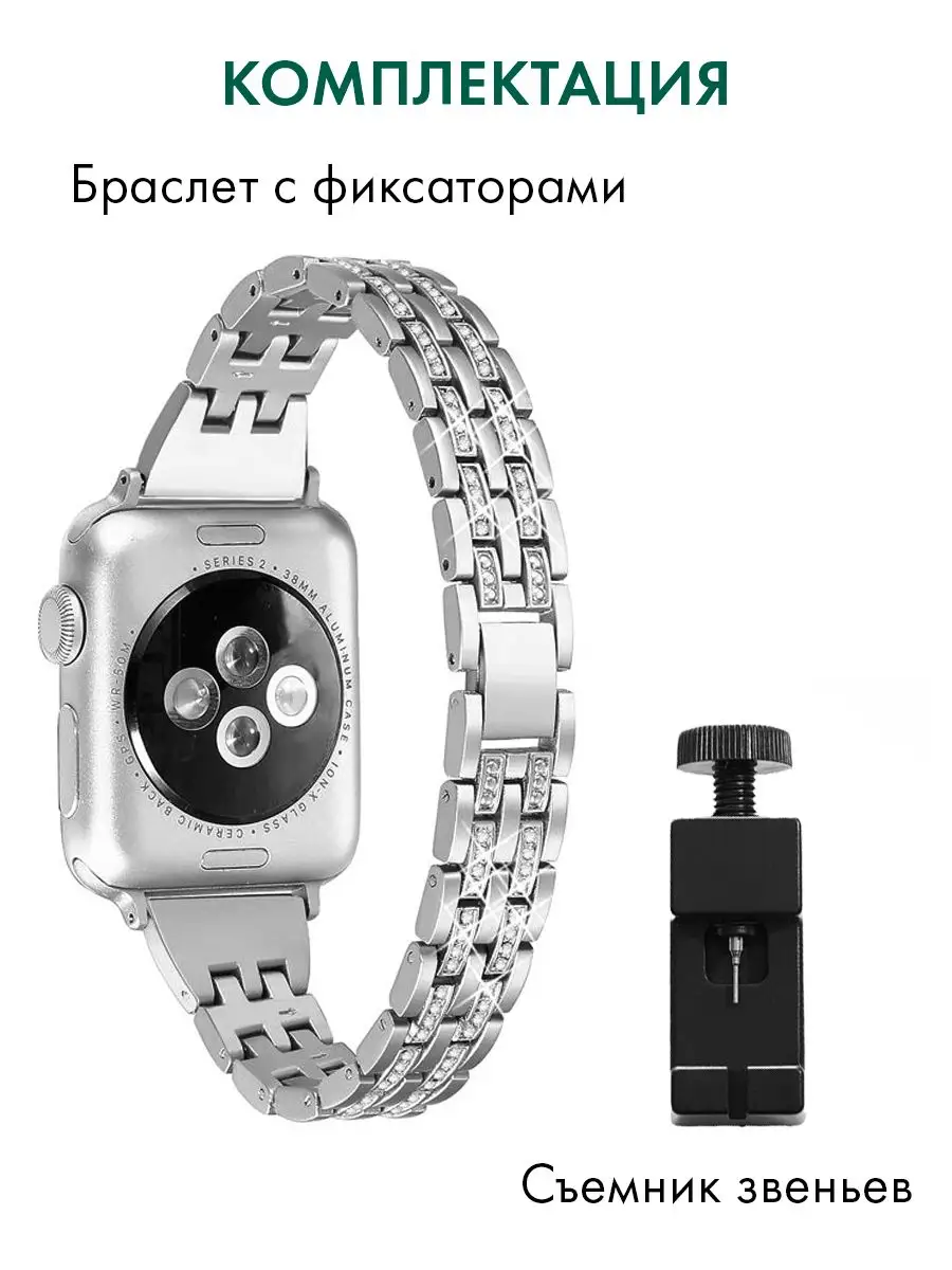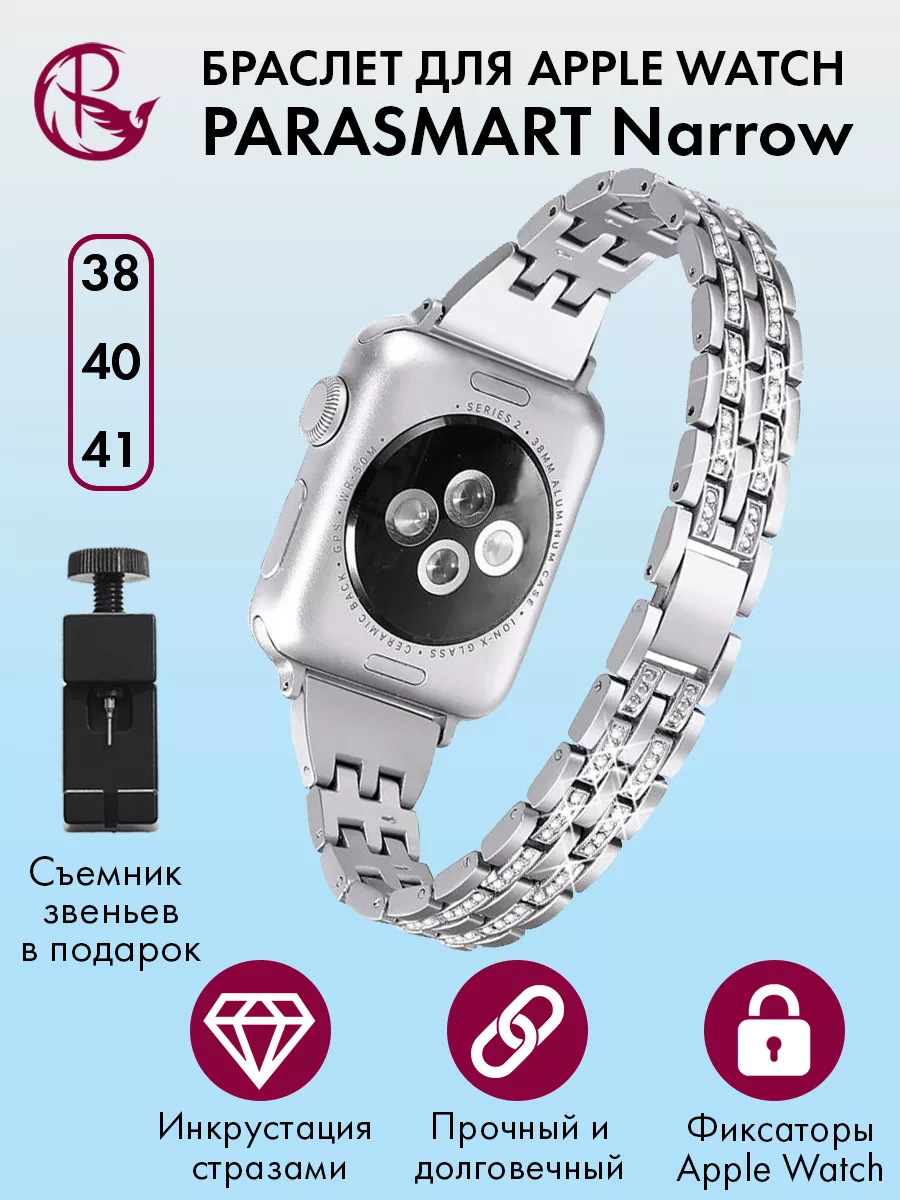 Ремешок для Apple Watch 38 40 41 мм – это стильный и элегантный аксессуар, который добавит изысканности вашим часам Apple Watch. Этот ремешок подходит для любых генераций с размерами корпуса 38 мм, 40 мм и 41 мм.Особенностью этого ремешка является его украшение стразами, которые придают ему блеск и привлекательность. Крупные стразы расположены на металлическом браслете, создавая эффектный и изысканный вид.Длина ремешка регулируется, что позволяет подогнать его под любой размер запястья. Благодаря съемным фиксаторам Apple Watch, установка и снятие ремешка происходит легко и быстро.Ремешок выполнен из качественных материалов, обеспечивающих долговечность и комфорт при ношении. Съемные звенья позволяют также настроить его по своим предпочтениям и получить оптимальную посадку на запястье.Этот ремешок для часов является отличным выбором для тех, кто хочет добавить нотку роскоши и стиля своим умным часам. Он подходит как для повседневного использования, так и для особых мероприятий, когда вы хотите выглядеть особенно элегантно.Не упустите возможность придать вашим смарт-часам новый облик с помощью этого великолепного ремешка со стразами. Покупайте его прямо сейчас и наслаждайтесь стильным и уникальным аксессуаром на вашем запястье. Все браслеты для часов PARASMART проходят проверку качества и обеспечиваются гарантией.
