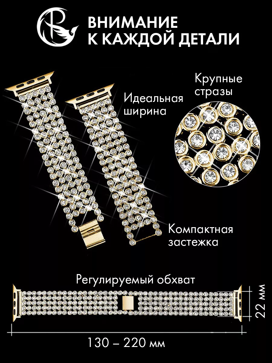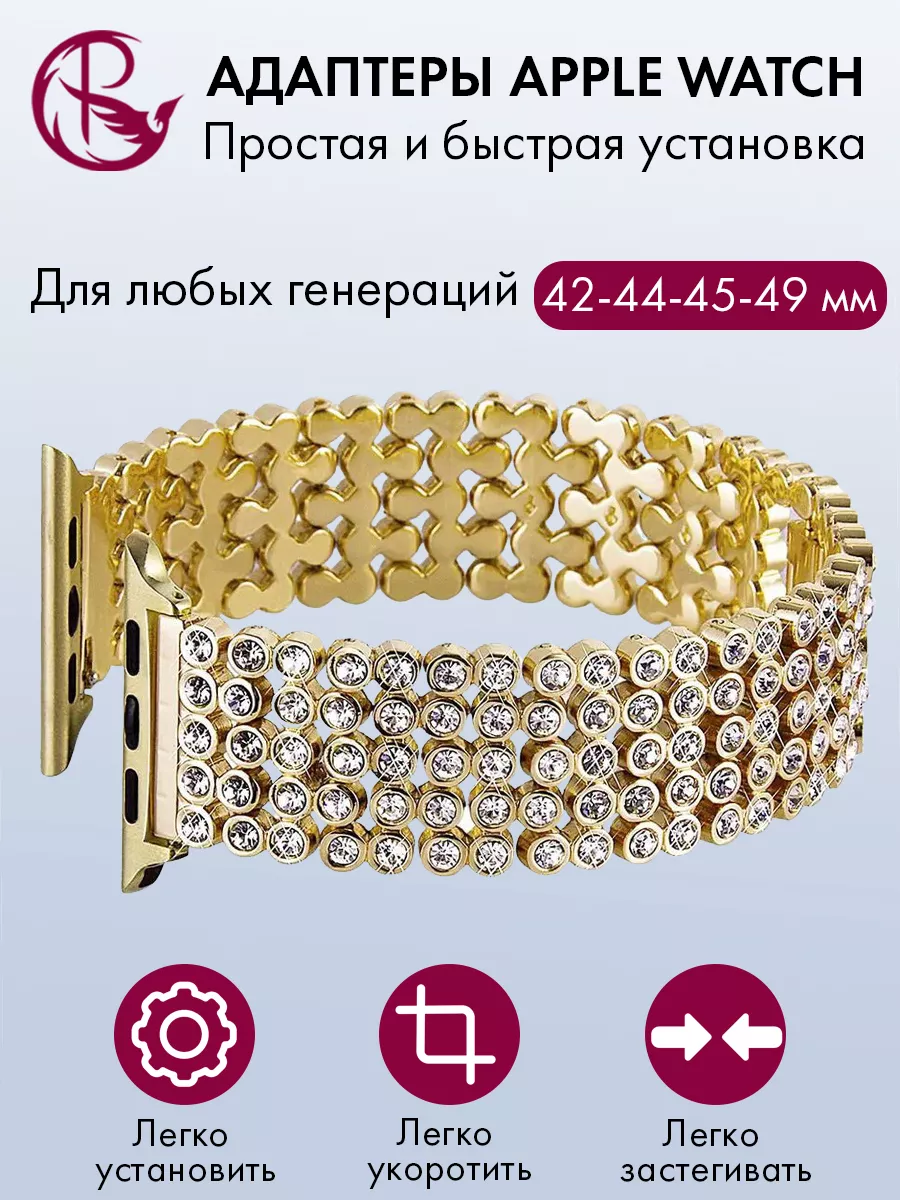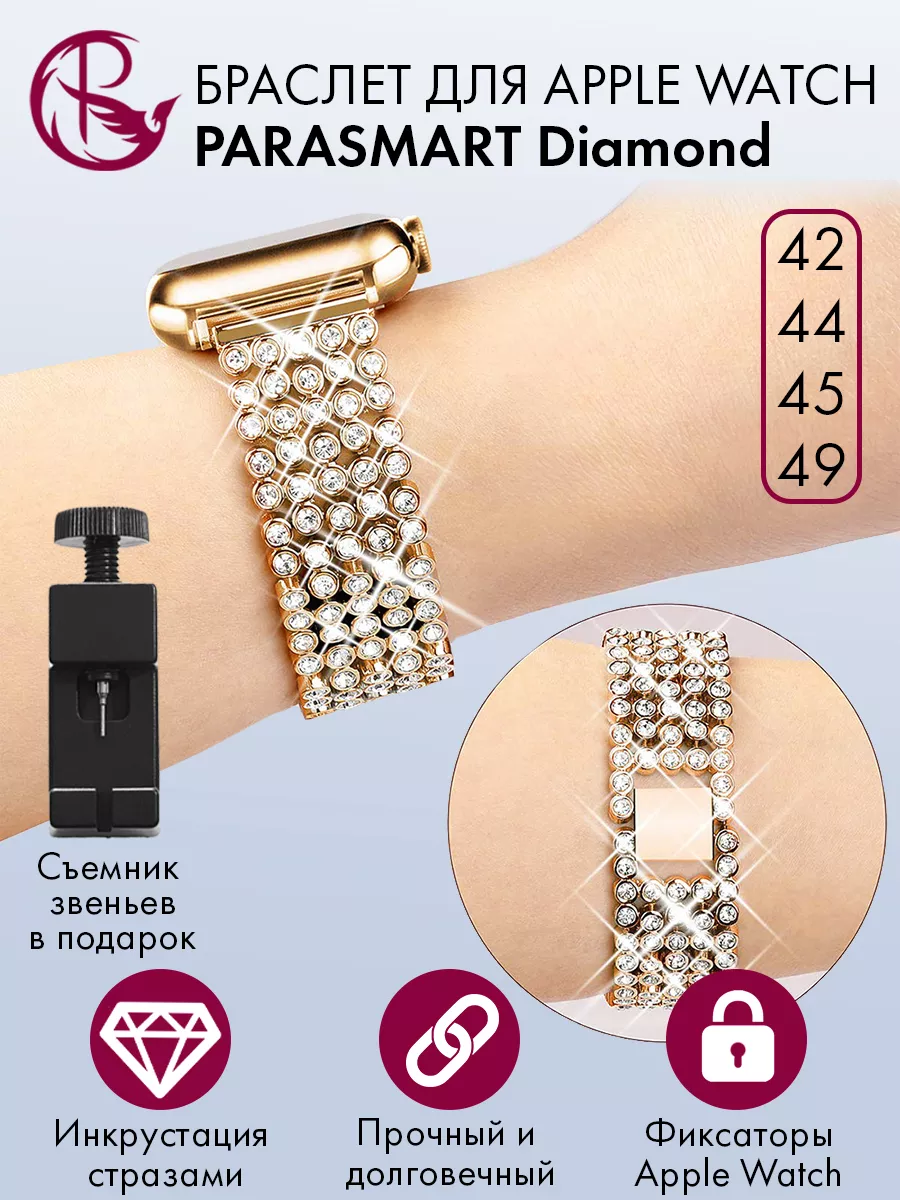 Ремешок для Apple Watch 42 44 45 49 мм – это стильный и элегантный аксессуар, который добавит изысканности вашим часам Apple Watch. Этот ремешок подходит для любых генераций с размерами корпуса 42 мм, 44 мм, 45 мм и 49 мм Ultra.Особенностью этого ремешка является его украшение стразами, которые придают ему блеск и привлекательность. Крупные стразы расположены на металлическом браслете, создавая эффектный и изысканный вид.Длина ремешка регулируется, что позволяет подогнать его под любой размер запястья. Благодаря съемным фиксаторам Apple Watch, установка и снятие ремешка происходит легко и быстро.Ремешок выполнен из качественных материалов, обеспечивающих долговечность и комфорт при ношении. Съемные звенья позволяют также настроить его по своим предпочтениям и получить оптимальную посадку на запястье.Этот ремешок для часов является отличным выбором для тех, кто хочет добавить нотку роскоши и стиля своим умным часам. Он подходит как для повседневного использования, так и для особых мероприятий, когда вы хотите выглядеть особенно элегантно.Не упустите возможность придать вашим смарт-часам новый облик с помощью этого великолепного ремешка со стразами. Покупайте его прямо сейчас и наслаждайтесь стильным и уникальным аксессуаром на вашем запястье. Все браслеты для часов PARASMART проходят проверку качества и обеспечиваются гарантией.