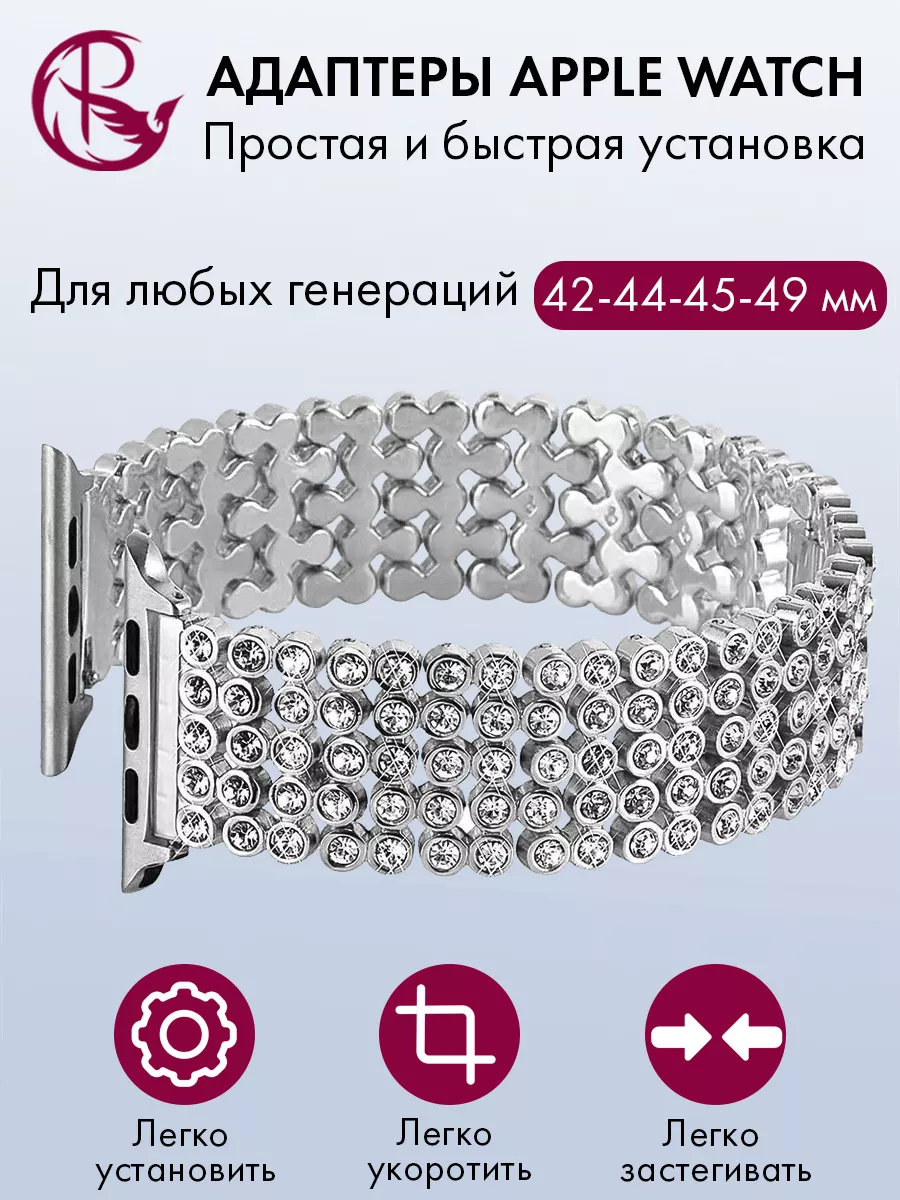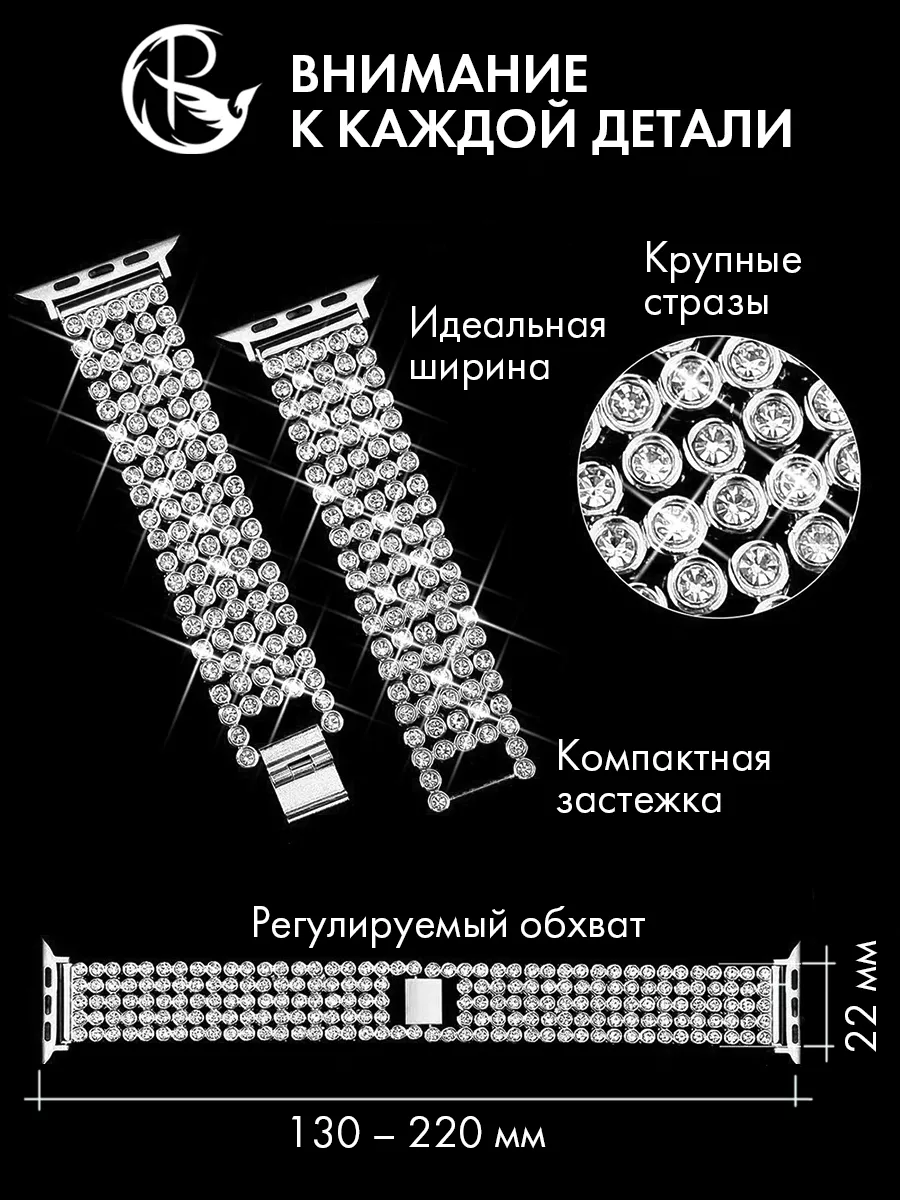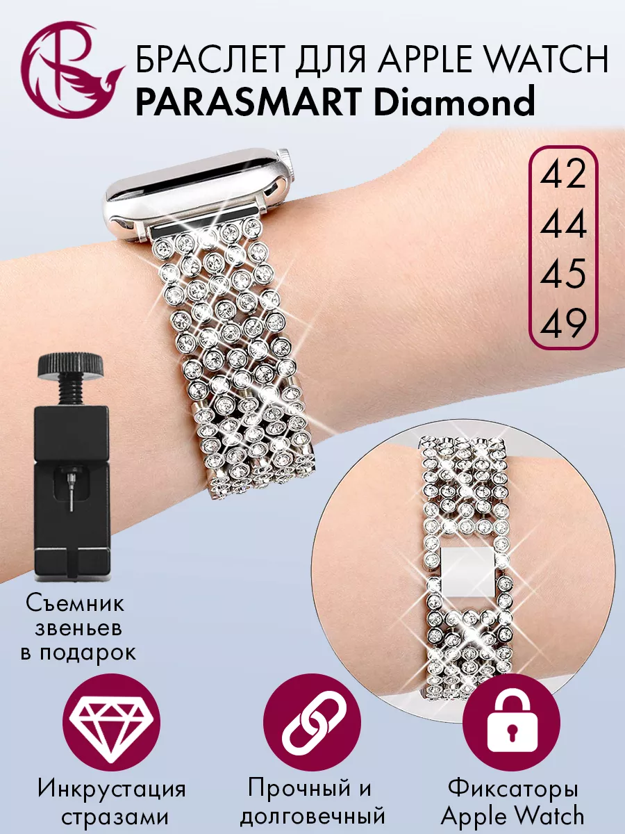 Ремешок для Apple Watch 42 44 45 49 мм – это стильный и элегантный аксессуар, который добавит изысканности вашим смартчасам Apple Watch. Этот ремешок подходит для любых генераций с размерами корпуса 42 мм, 44 мм, 45 мм и 49 мм Ultra.Особенностью этого ремешка является его украшение стразами, которые придают ему блеск и привлекательность. Крупные стразы расположены на металлическом браслете, создавая эффектный и изысканный вид.Длина ремешка регулируется, что позволяет подогнать его под любой размер запястья. Благодаря съемным фиксаторам Apple Watch, установка и снятие ремняпроисходит легко и быстро. Ремешок выполнен из качественных материалов, обеспечивающих долговечность и комфорт при ношении. Съемные звенья позволяют также настроить его по своим предпочтениям и получить оптимальную посадку на запястье. Этот ременьдля smartчасов является отличным выбором для тех, кто хочет добавить нотку роскоши и стиля своим умным часам. Он подходит как для повседневного использования, так и для особых мероприятий, когда вы хотите выглядеть особенно элегантно. Не упустите возможность придать вашим эпл вотч новый облик с помощью этого великолепного ремешка на smart watchсо стразами. Покупайте оригинал PARASMART прямо сейчас и наслаждайтесь стильным и уникальным аксессуаром на вашем запястье. Все браслетына часыпроходят проверку качества и обеспечиваются гарантией.