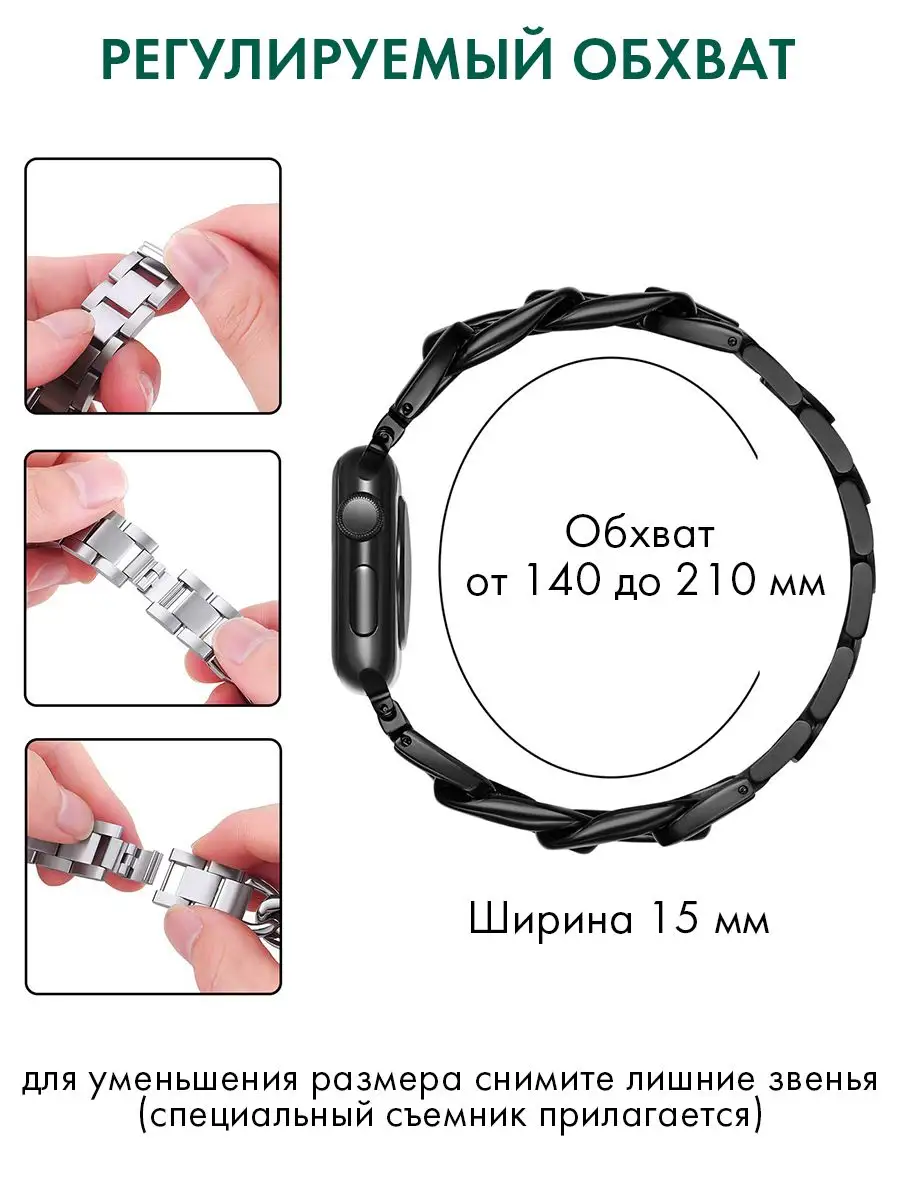 Не знаете, как улучшить внешний вид своего Apple Watch? Мы знаем, что нужно! Наш металлический ремешок для Apple Watch - это идеальное решение для тех, кто хочет придать своим часам новый стиль и класс. Наш ремешок для Apple Watch идеально подходит для моделей 44mm, 40mm, 45mm, и 38mm и обеспечивает легкую и удобную посадку на руку. Изготовленный из высококачественных материалов, наш ремешок обеспечивает надежность и долговечность. Этот металлический ремешок для Apple Watch также является универсальным и подходит для любого образа и события. Он прекрасно сочетается с любыми видами одежды и обуви, от повседневной одежды до деловых нарядов. Наш браслет на часы Apple Watch также является идеальным подарком для тех, кто хочет придать своим часам новый облик. Добавьте стиль и класс в свою жизнь с нашим металлическим ремешком для Apple Watch. Не забудьте, что наш металлический ремешок для Apple Watch является лучшим выбором для обновления вашего часового аксессуара, поэтому не упустите свой шанс. Закажите сегодня и получите уникальный и стильный аксессуар для своих часов Apple Watch.