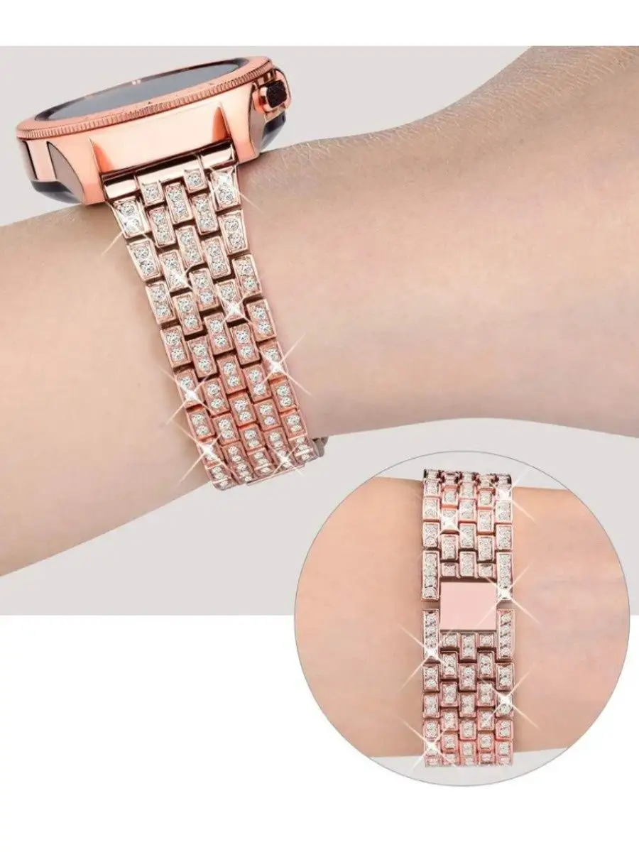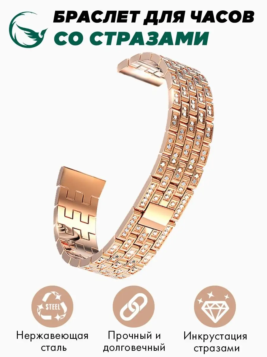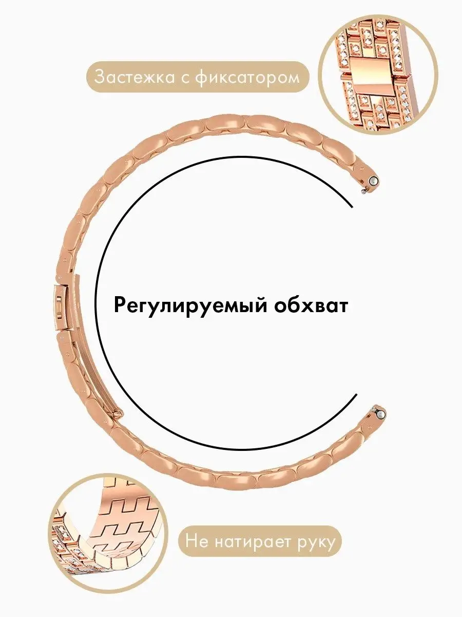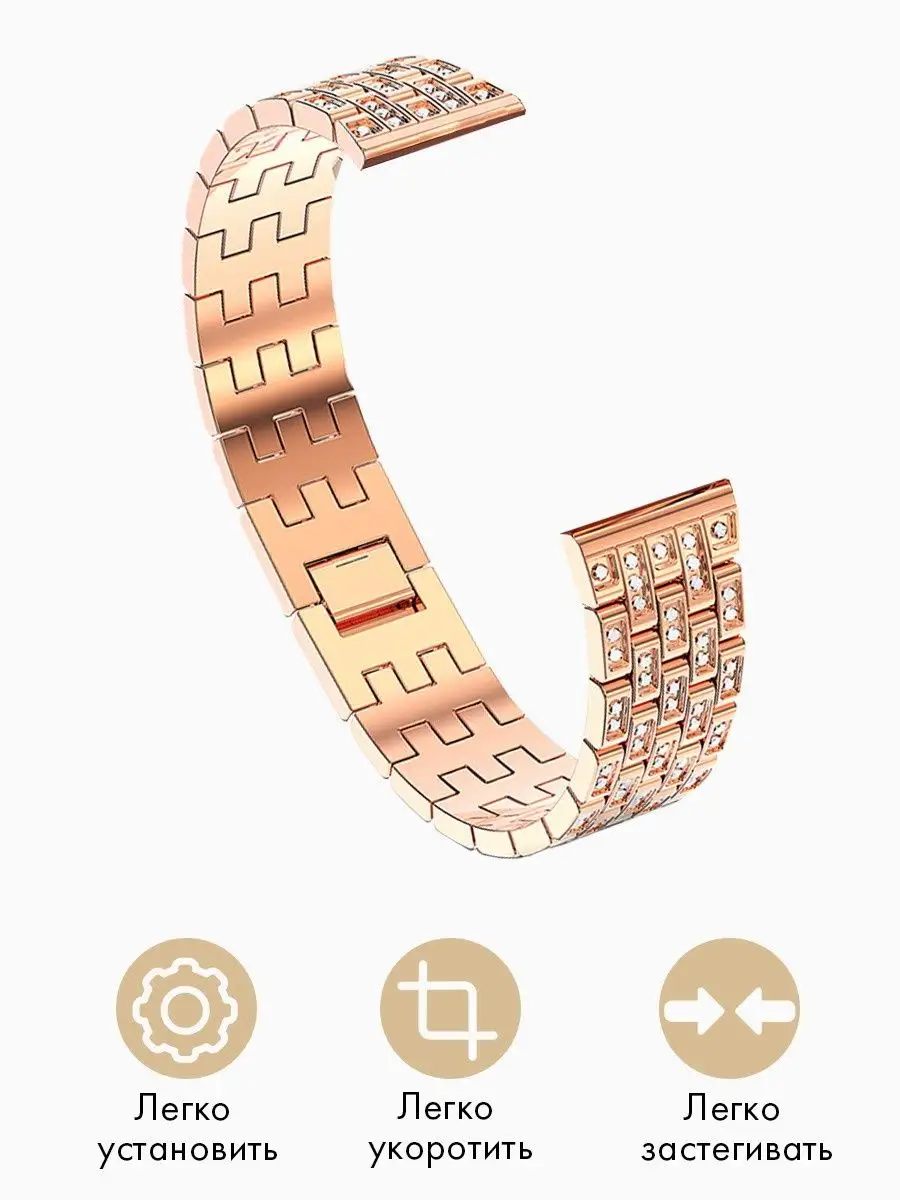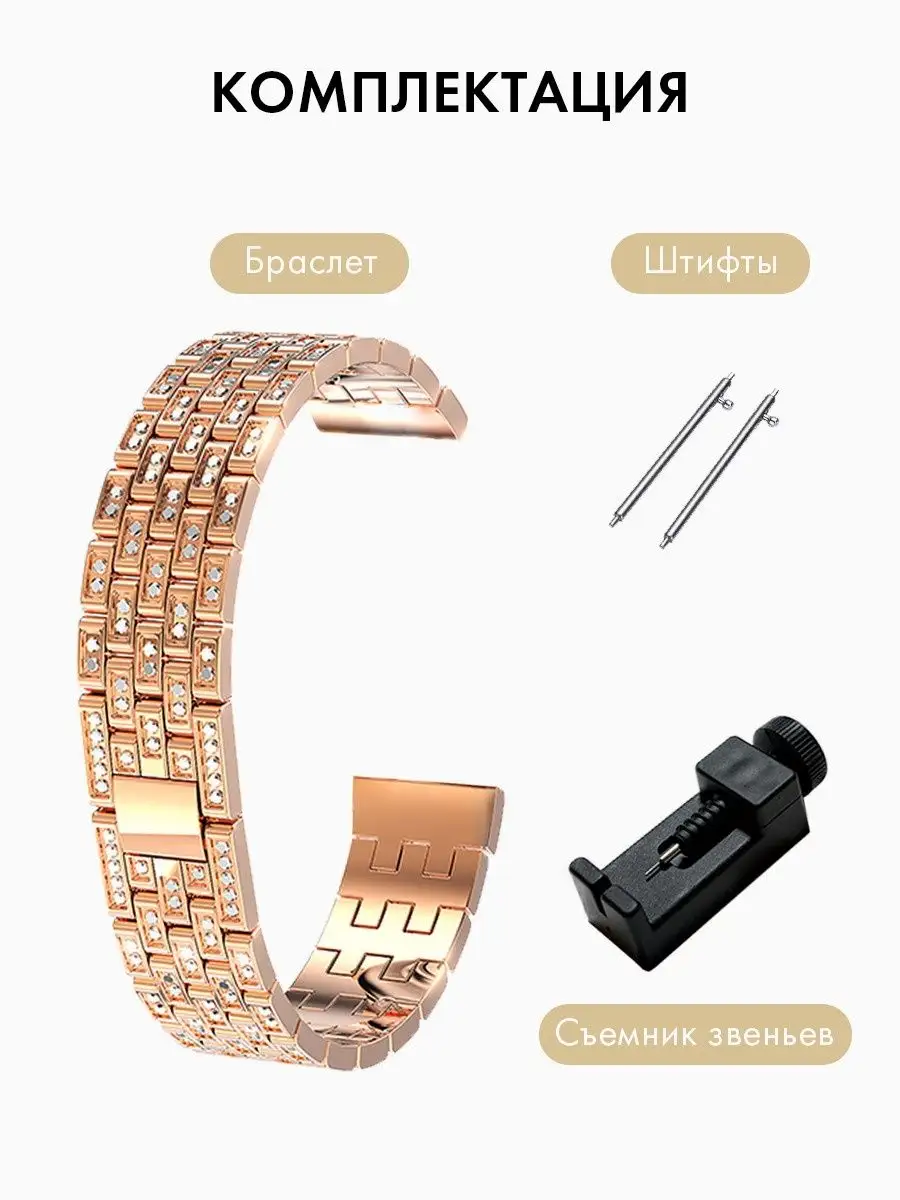 Браслет металлический со стразами для часов - универсальный гибкий металлический ремешок из многих звеньев, который подходит для любых часов со стандартным креплением на штифтах. Вы можете кардинально изменить свой образ, всего лишь поменяв стандартный ремешок на этот красивый аксессуар со стразами. Аксессуар подходит для большинства женских и мужских смарт часов, в частности Xiaomi, Huawei, Samsung, Casio, Amazfit, KingWear, Lemfo и многих других. Вы можете самостоятельно измерить расстояние между дужками своих часов и проверить, подходит ли к ним данный ремешок по размеру. Браслет легко можно установить самостоятельно. Регулировка осуществляется путем снятия лишних звеньев. Для этого не требуется посещение часовой мастерской, вы легко справитесь за пару минут - используйте устройство-съемник, которое, как и штифты, идет в комплекте.