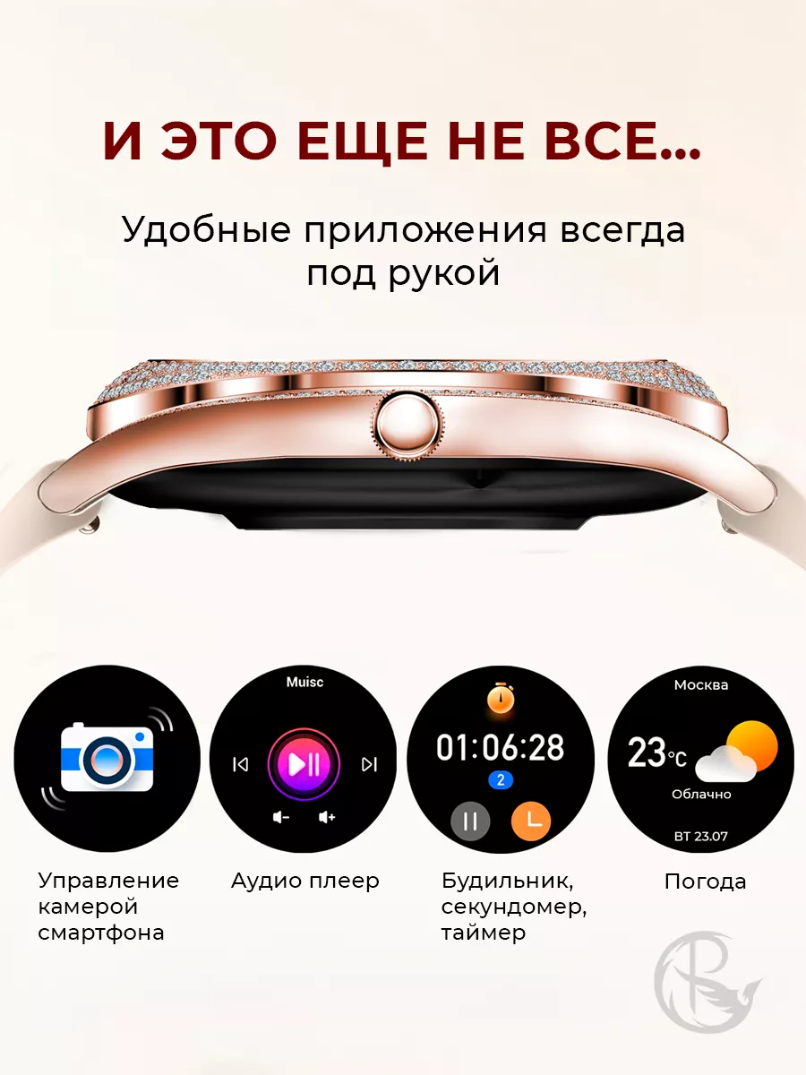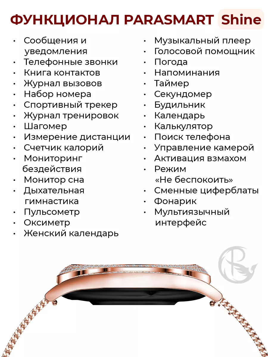 Представляем смарт часы PARASMART Shine — не просто умные часы, а ваш личный ассистент, украшение и тренер, всё в одном изящном аксессуаре. Вы когда-нибудь задумывались, как много функций может совмещать в себе небольшой предмет на вашем запястье? PARASMART Shine - это не только время. Это 150 искрящихся стразов, которые придадут вашему образу неповторимый шик. Металлический ремешок гарантирует долговечность и стильный вид. А голосовой помощник позволяет управлять основными функциями без использования рук. Благодаря возможности совершать телефонные вызовы прямо с часов, вы больше не пропустите важное сообщение или звонок. Для активных и заботящихся о своём здоровье — шагомер, мониторинг пульса и уровня кислорода помогут следить за состоянием вашего тела. Монитор сна поможет оптимизировать ваш отдых для полноценной энергии на следующий день. А женский календарь станет незаменимым помощником для каждой представительницы прекрасного пола. Amoled дисплей обеспечивает яркость и чёткость изображения при любом освещении. А более 100 вариантов тренировок позволят подобрать идеальный комплекс упражнений специально для вас. Управление плеером на запястье? Легко! Следите за своими любимыми треками без лишних движений. Огромный выбор сменных циферблатов доступен через приложение — выбирайте под настроение или под стиль одежды. Не беспокойтесь о частоте подзарядки – до 15 дней работы от одного заряда делают фитнес браслет PARASMART незаменимыми в долгих поездках или напряженных рабочих неделях. И да, они не боятся воды! Смарт часы Shine — это выбор тех, кто ценит красоту, функциональность и независимость. Подарите их особенному человеку или порадуйте себя — потому что вы этого достойны!