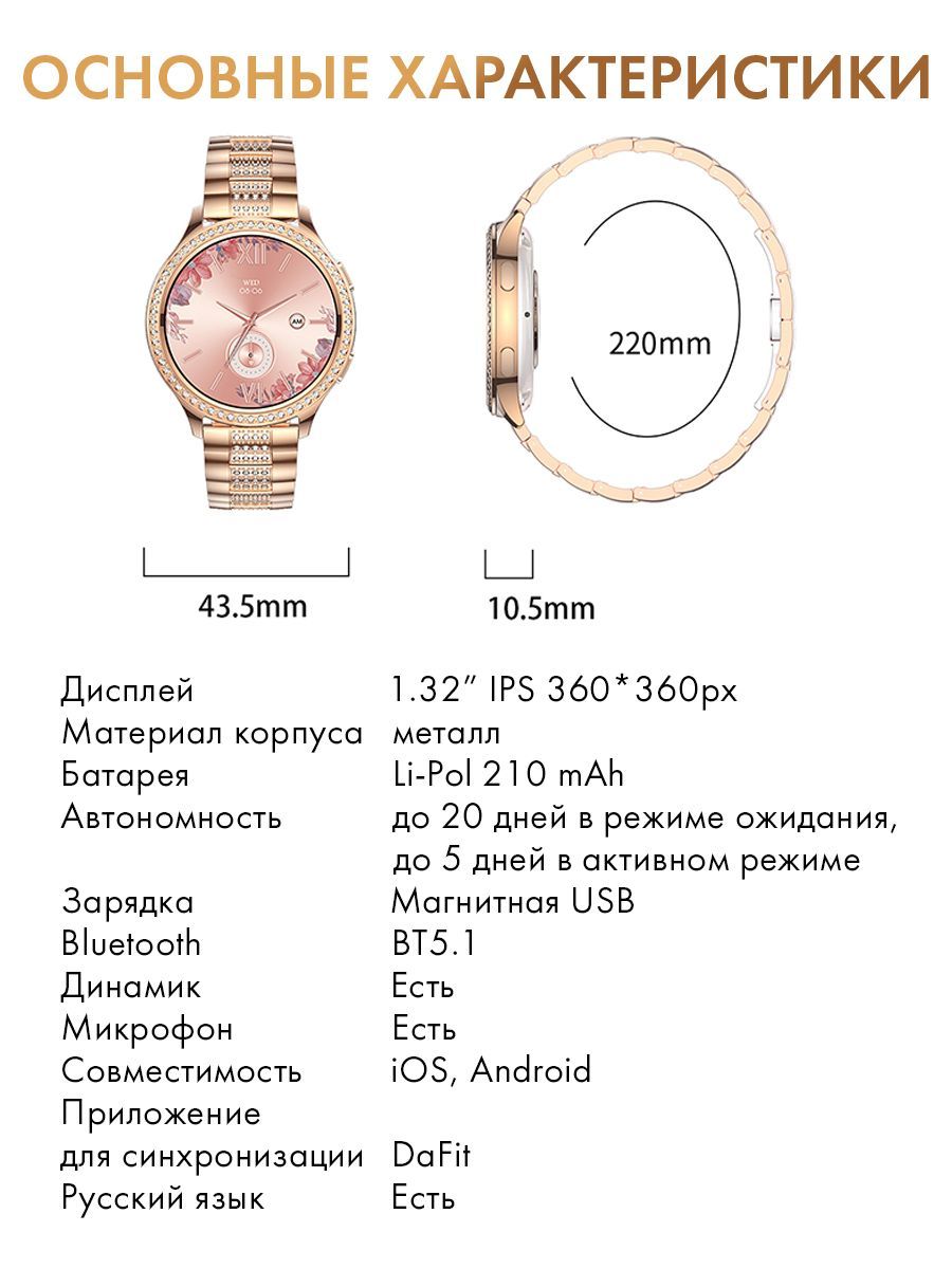 Смарт часы PARASMART Afrodita - влагозащищенные женские умные часы с Bluetooth, в которых по максимуму реализован функционал современных smart watch среднего ценового сегмента. Прочный корпус классической круглой формы, удобный металлический ремешок, яркий сенсорный дисплей высокого разрешения, встроенные динамик и микрофон HD качества, а также заряженная электронная начинка - все это позволяет считать Venera, пожалуй, оптимальным выбором по соотношению цена-качество. Наручный гаджет для взрослого оснащен спортивным трекером с выбором вида тренировки, шагомером, секундомером, будильником, таймером, модулем управления плеером и камерой смартфона, приложением погода, антипотеряшкой для поиска телефона. Также фитнес браслет измеряет артериальное давление, пульс и уровень кислорода в крови, мониторит сон. После синхронизации через бесплатное приложение FitCloudPro фиксируются и сохраняются показатели здоровья и нагрузок. Помимо этого, можно читать сообщения и уведомления прямо на экране часов, отклонять нежелательные звонки, настраивать напоминания и режим тишины. Но это еще не все! Благодаря наличию динамика и микрофона PARASMART являются полноценной гарнитурой со встроенным голосовым помощником. Вы можете не только принимать звонки и говорить с помощью этого устройства не доставая смартфон, но и совершать исходящие вызовы. Для этого достаточно дополнительно подключить устройство через раздел блютуз смартфона. Часы подойдут как девушкам, так и женщинам. В аксессуаре есть календарь женских физиологических циклов. Стиль меню можно настроить под свои предпочтения, а огромный выбор циферблатов позволит подобрать заставку под настроение. Smart watch PARASMART совместимы с андроид устройствами и айфонами.
