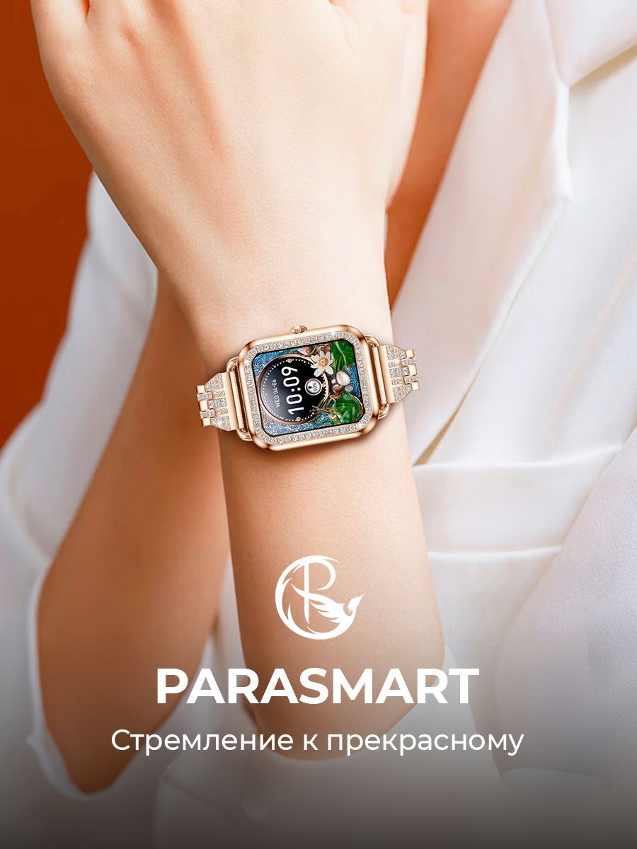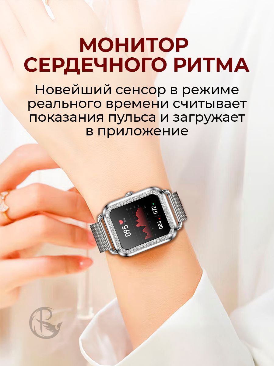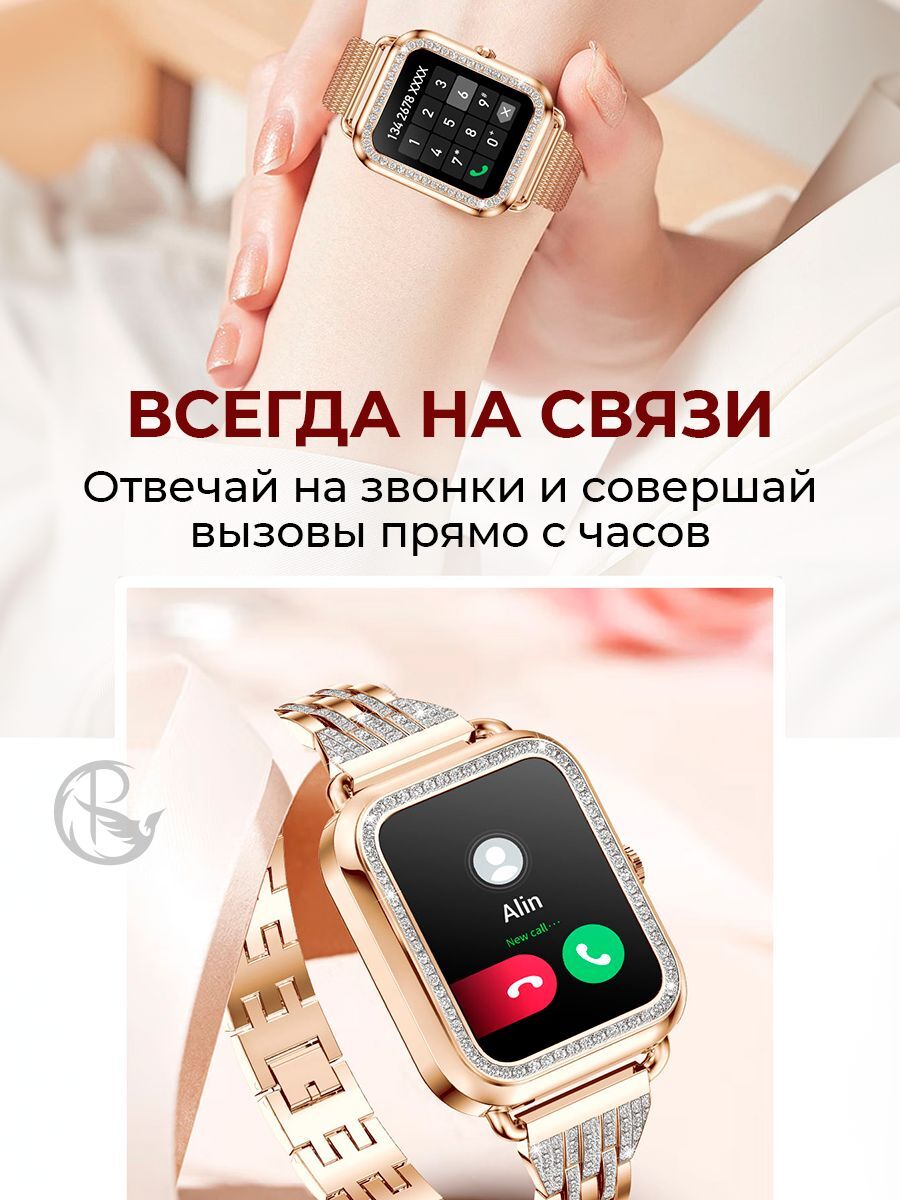 Особенность smart watch – квадратная форма, которая придаёт устройству современный и элегантный вид. корпус и браслет в золотом цвете со стразами добавляют прочности и долговечности, подчеркивая ваш утонченный вкус.