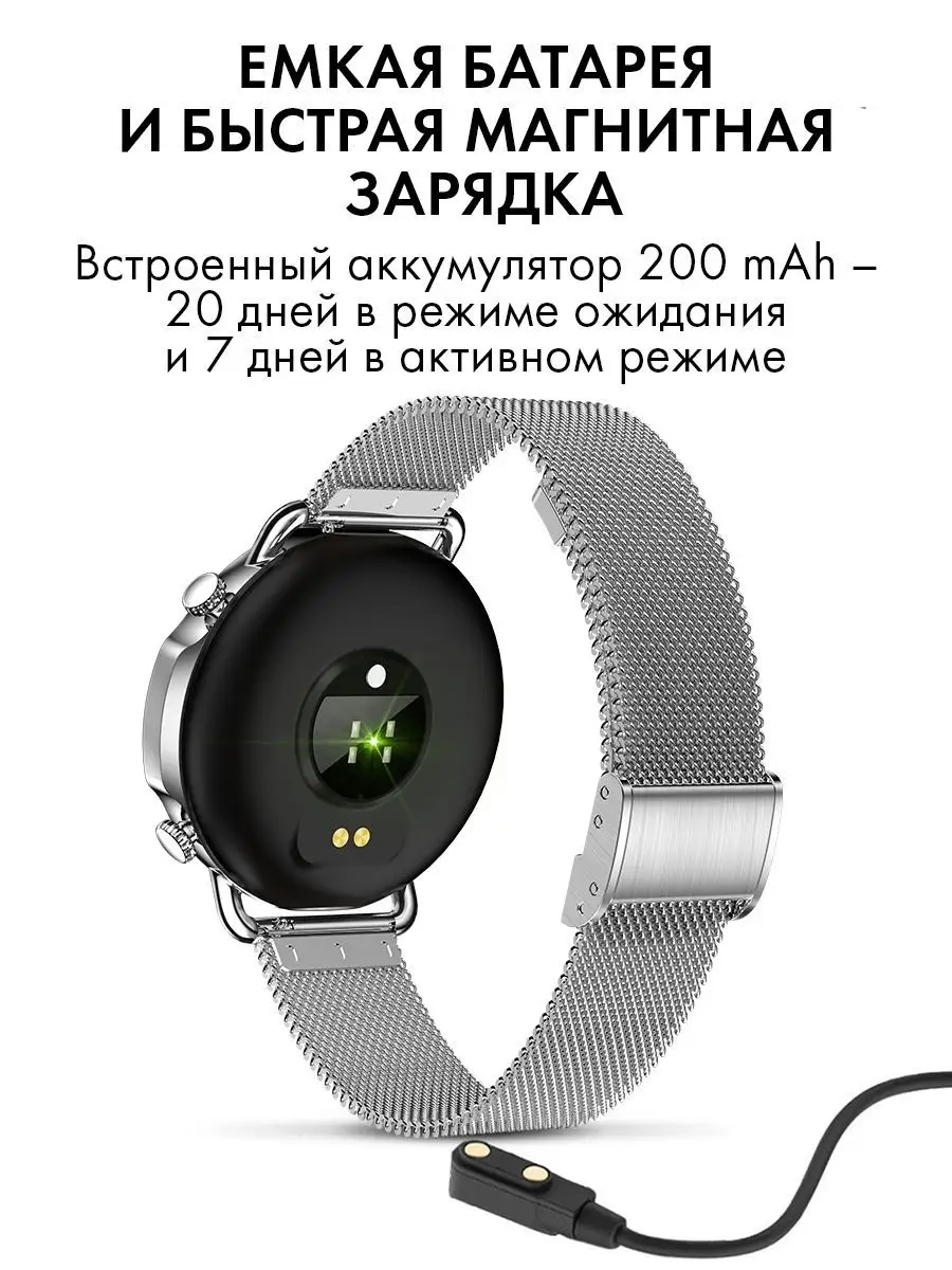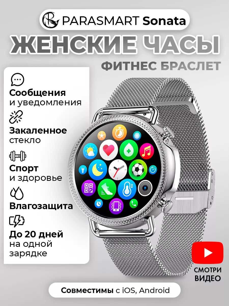 Смарт часы PARASMART Sonata - это наручный персональный помощник, с которым ваши повседневные задачи станут проще и приятнее. Со Smart Watch вы сможете получать уведомления о входящих сообщениях и звонках, управлять плеером и камерой смартфона, наблюдать за результатами свой физической активности с помощью шагомера, отслеживать качество сна прямо на экране браслета. С фитнес браслетом удобно мониторить состояние здоровья благодаря функциям тонометра, пульсометра, термометра и трекера уровня кислорода в крови. Конечно, здесь есть будильник, секундомер и таймер. Женский умный аксессуар Sonata - это смарт часы в круглом металлическом корпусе, с гибким металлическим ремешком Миланская петля - устройство очень удобно носить. Умные часы станут притяжением внимания и прекрасным дополнением к любому образу. Подойдут и девочкам подросткам, и взрослым. Встроенная игра Young Bird не позволит заскучать. Стильный гаджет представлен в двух цветах: золотой и серебряный. Электронные часы совместимы с устройствами на платформе Андроид и iOS.
