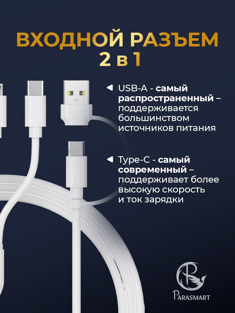 Универсальная зарядка для 4 устройств – ваш незаменимый помощник в мире гаджетов. Забудьте о куче проводов и разнообразных адаптерах, которые занимают все свободные розетки в доме. Представляем вам простое и в то же время функциональное решение от PARASMART, которое призвано облегчить вашу жизнь и добавить удобства. Это не просто провод, шнур тайпси или лайтнинг - это центр питания для вашего технологического арсенала. Зарядник имеет безупречную совместимость: от iPhone до Apple Watch, от iPad до любых девайсов с Type-C – этот инновационный продукт способен обеспечить энергией все самое необходимое.Четыре в одном: представьте себе ситуацию, когда все ваши гаджеты нуждаются в подзарядке одновременно. Что делать? Решение есть! Наш многофункциональный smart кабель позволяет подключить четыре устройства одновременно, благодаря наличию айфоновского разъема Lightning, двум Type-C и магнитной подставке для смарт часов. И это при том, что длина шнура оптимальна – 1 метр, не считая разветвителя! И это еще не все – разъем питания в данном кабеле – 2 в 1! Это USB-A и USB-C, данное обстоятельство кратно повышает возможности девайса для айфона, андроид и смарт часов. Стабильная и безопасная: скорость – это то, что ценится превыше всего. Наш продукт поддерживает функцию быстрой зарядки, чтобы вы могли вернуться к использованию своих гаджетов как можно скорее. А система защиты от скачков напряжения и перегрева обеспечивает безопасность каждому из них. Мощные магниты: качество – это о наших магнитах. Они не только надежно держат ваш Apple Watch, но и обеспечивают стабильное соединение каждый раз. Универсальное зарядное устройство для умных эппл вотч, телефона, airpods и других – это выбор тех, кто ценит свое время и пространство. Это умное решение для тех, кто хочет быть всегда на связи и для кого каждая минута на счету. Сделайте шаг навстречу будущему уже сегодня — выберите универсальную зарядку от PARASMART и позвольте ей стать вашим личным помощником в мире технологий!