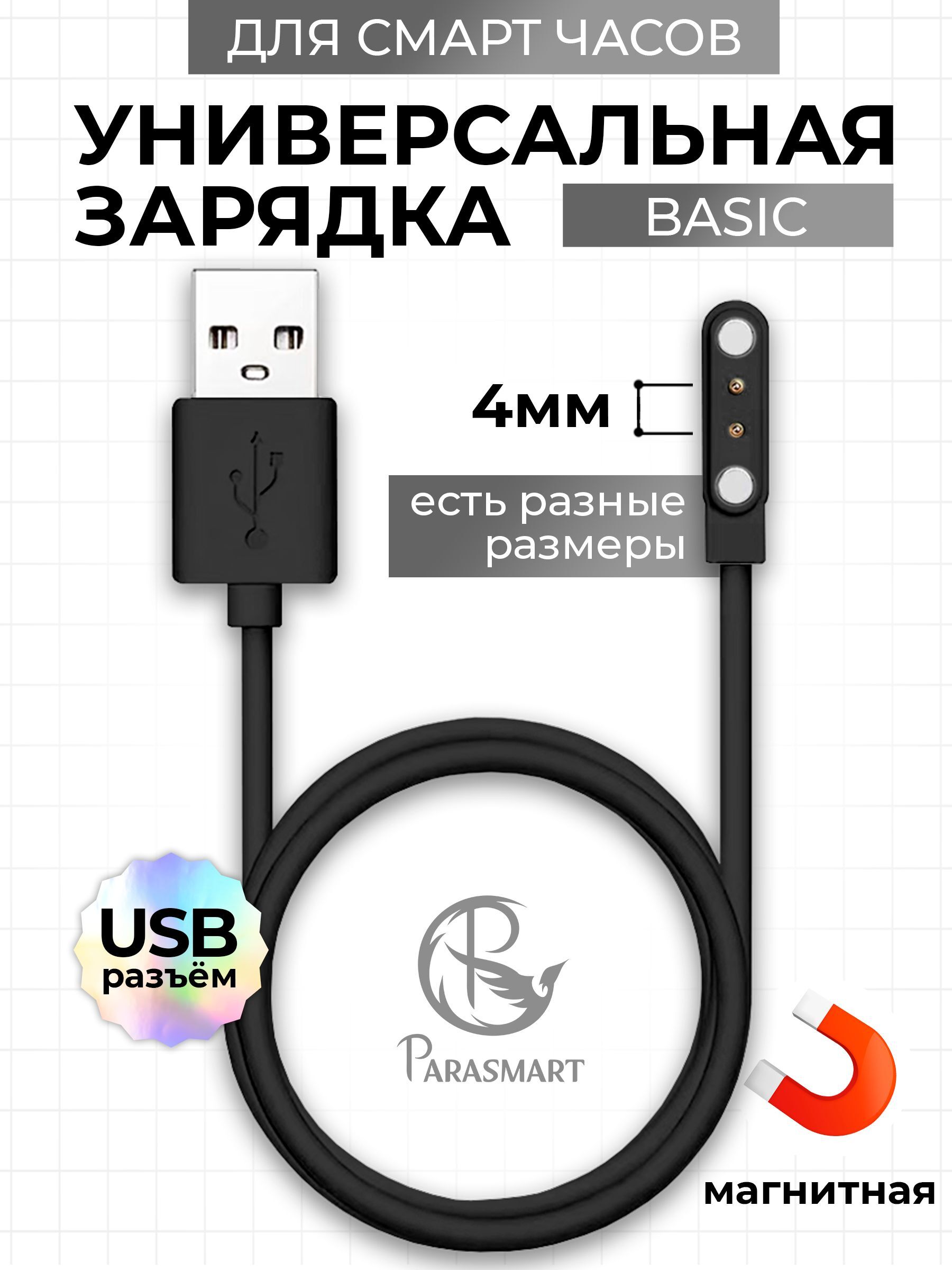 Магнитный кабель PARASMART предназначен для быстрой зарядки смарт часов и браслетов. Устройство является универсальным и подходит для большинства мужских и женских смарт часов с контактами 2 pin или 4 pin (и даже 5 pin, если они расположены буквой Т), а также детских Smart Baby Watch с сим картой и GPS. Если помимо зарядки требуется передача данных между часами и компьютером, выбирайте модификацию 4 pin (при условии, что размер соответствует). Во всех остальных случаях подойдет беспроводная магнитная зарядка 2 pin. Особенности зарядных кабелей PARASMART – медные подпружиненные контакты, оптимальная длина и качественная изоляция провода.